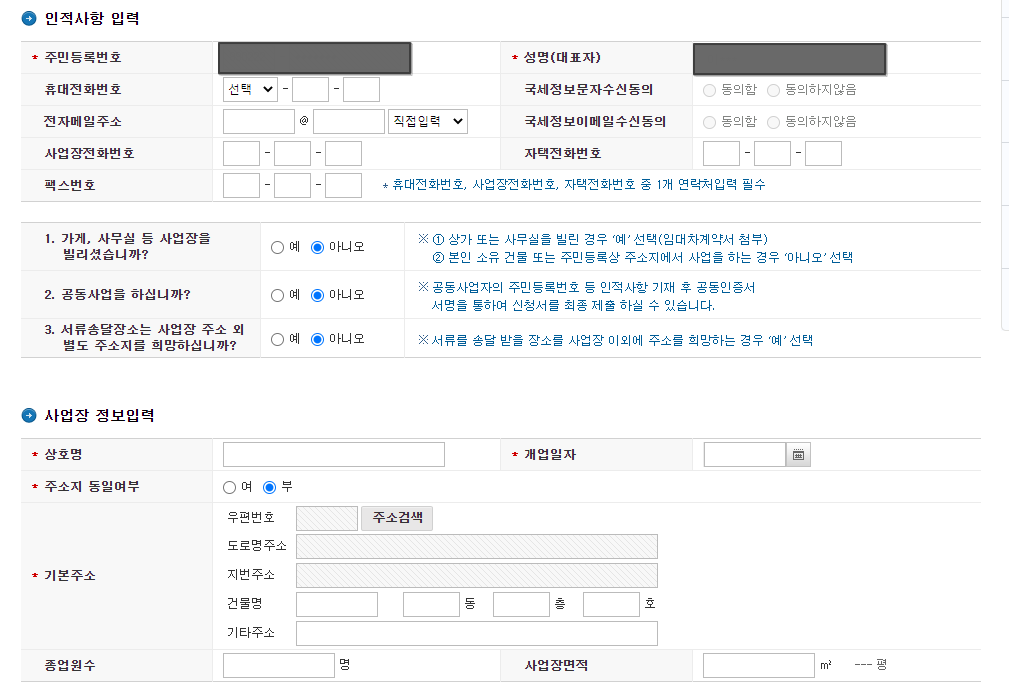6) 행정이용 공동이용 정보 Check > 업소기본정보, 대표자, 소재지, 업소상세정보, 첨부서류 기입